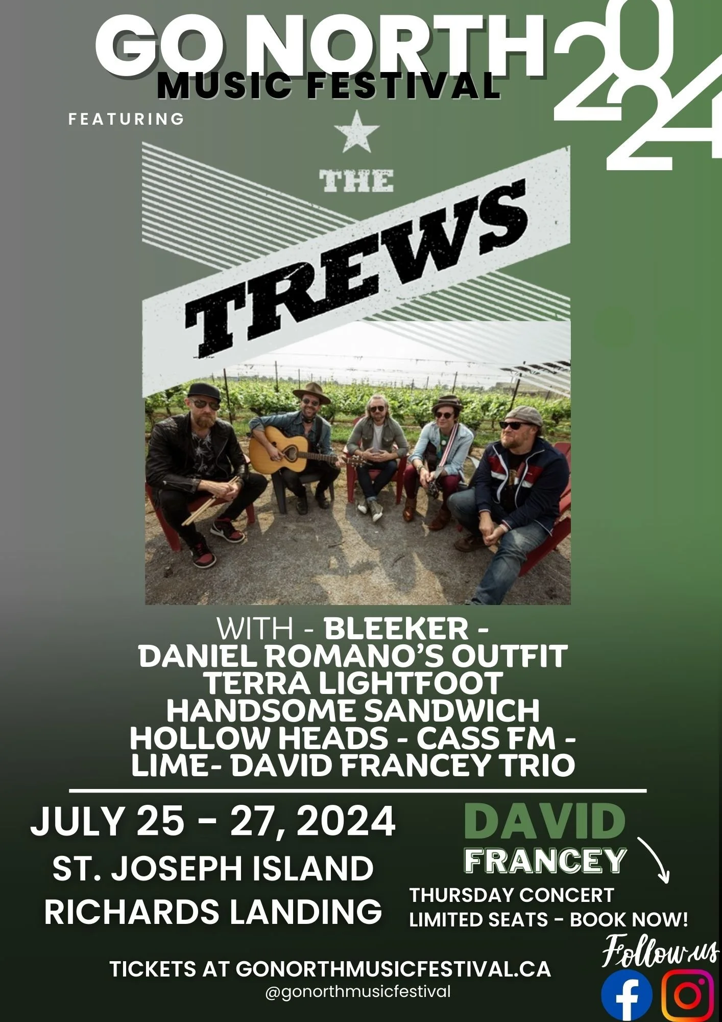If there's a kids stage again featuring scheduled acts playing mini-sets in an alternate locale, organizers haven't said. Tomorrow night's headliners are Juno Award nominated Nova Scotia alt-hard rock quintet The Trews in their first local date since opening for Marianas Trench in the Soo in 2022, and their first headlining date up here since 2009. With songs like "Not Ready To Go", "What's Fair Is Fair", and "Hold Me In Your Arms" in their back catalogue, it will be great to see The Trews' diverse but hard rocking sound back on a local stage, and I do like many of their songs, so this will sure be a different way to experience them! Orillia garage rock band Bleeker will co-headline tomorrow in their first local date since opening for Airbourne in the Soo in 2013 under their old name Bleeker Ridge, back when they played an overall heavier style of music. They're still talented, and their current sound is a better Go North fit!